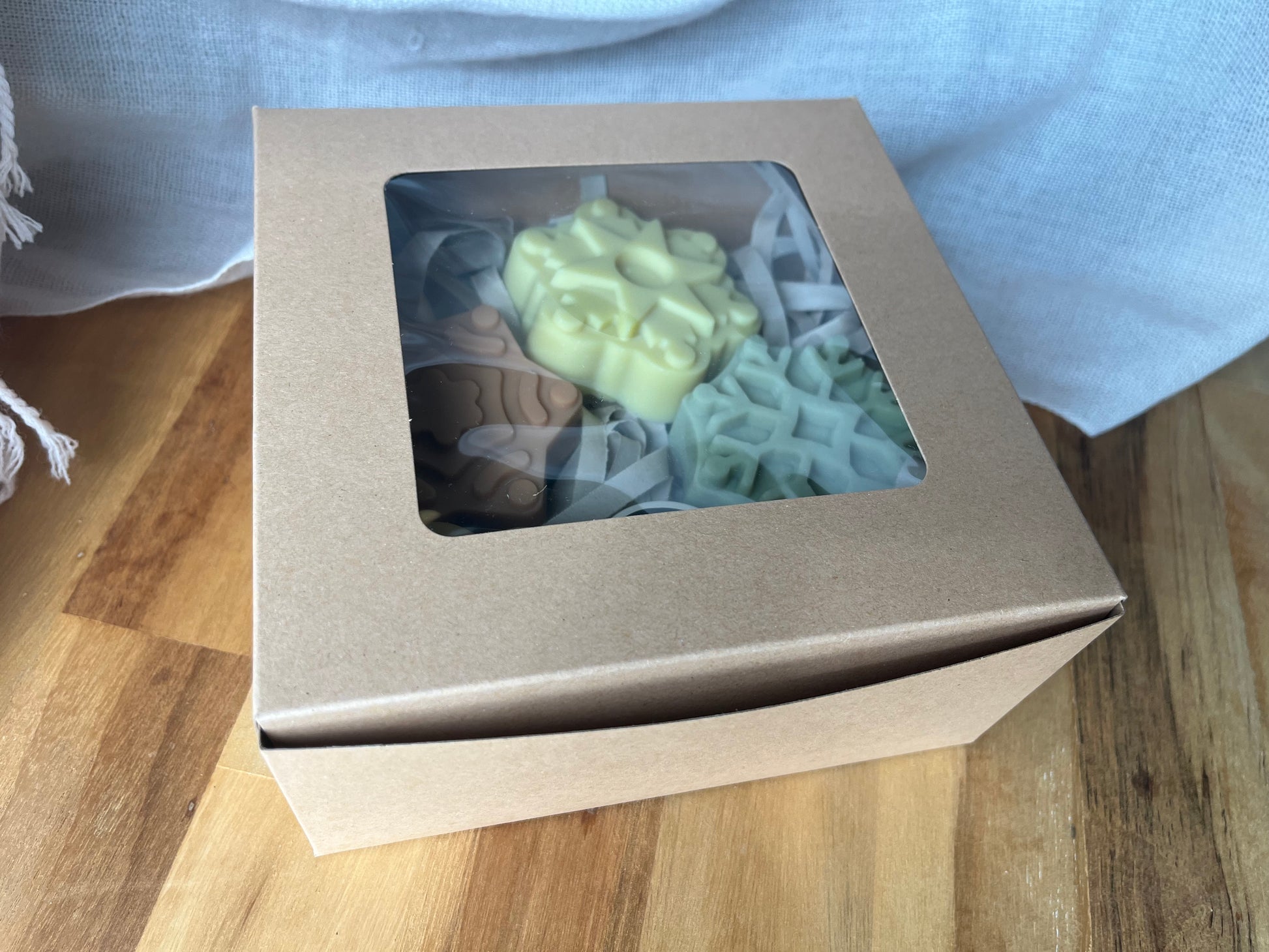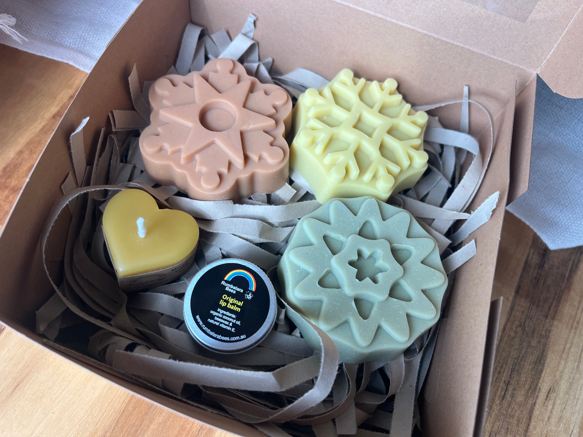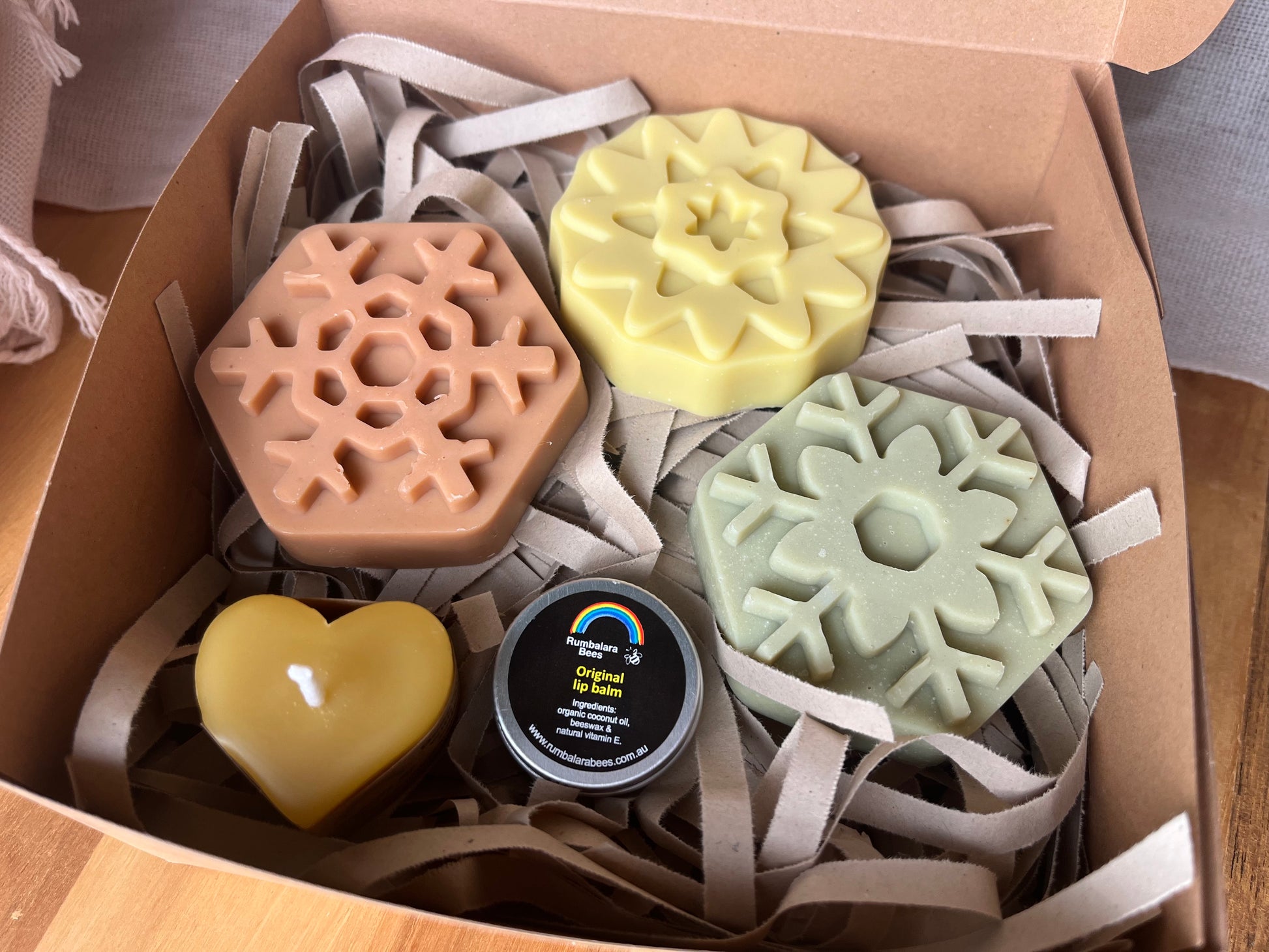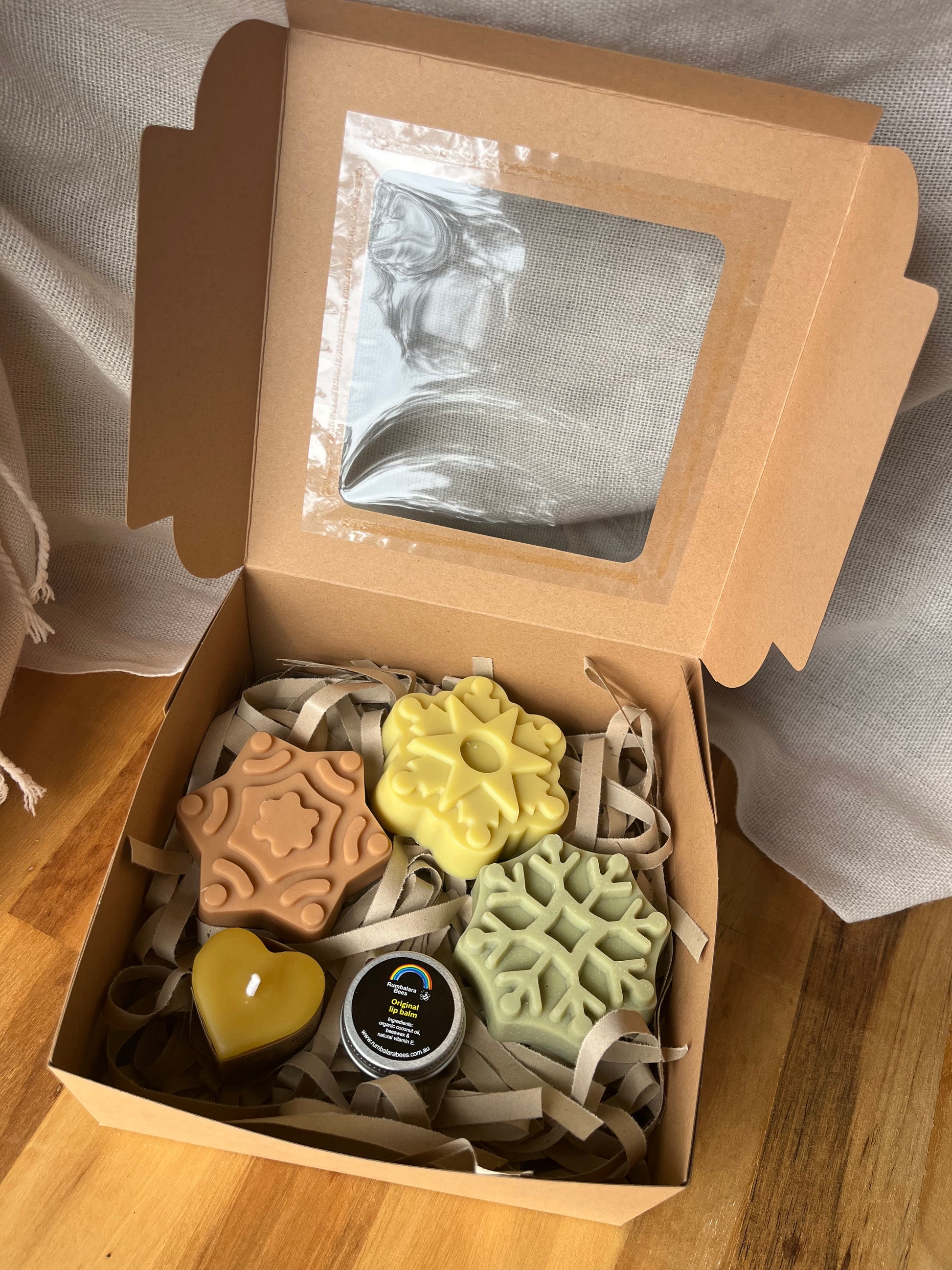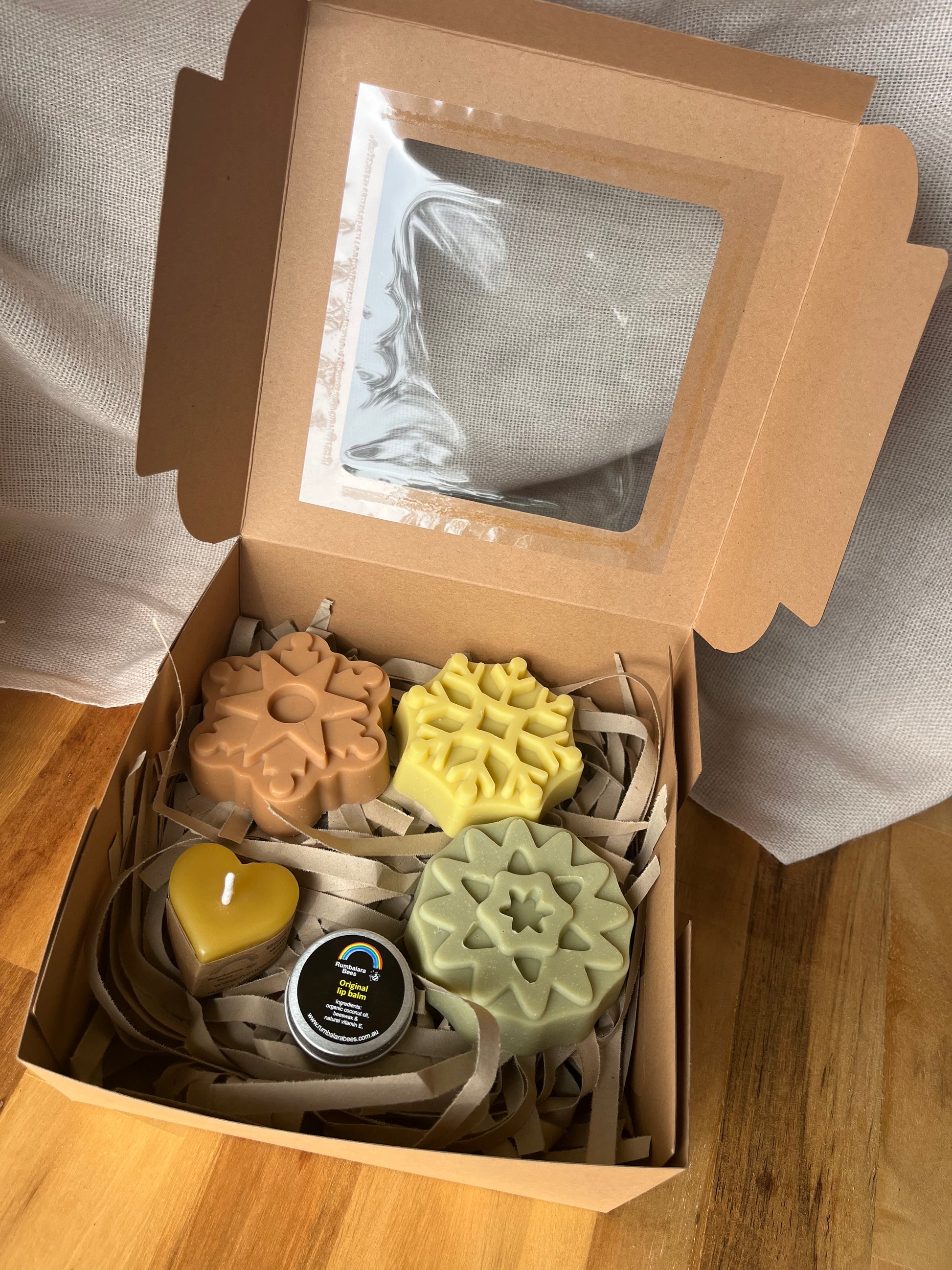 Give a special handmade gift this Christmas with this Christmas gift box. Includes a natural lip balm, heart shaped beeswax candle and three handmade snowflake soaps;